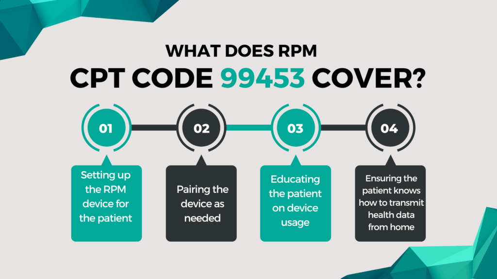 CPT Code 99453 is used to bill for the one-time setup of a remote monitoring device and training the patient or caregiver on how to use it as part of a Remote Patient Monitoring (RPM) program.