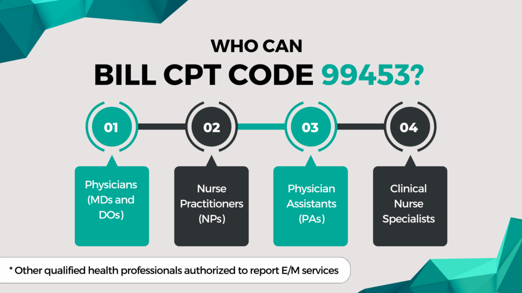 CPT Code 99453 can be billed by healthcare professionals who are eligible to report evaluation and management (E/M) services. This includes physicians and non-physician practitioners such as nurse practitioners (NPs) and physician assistants (PAs).